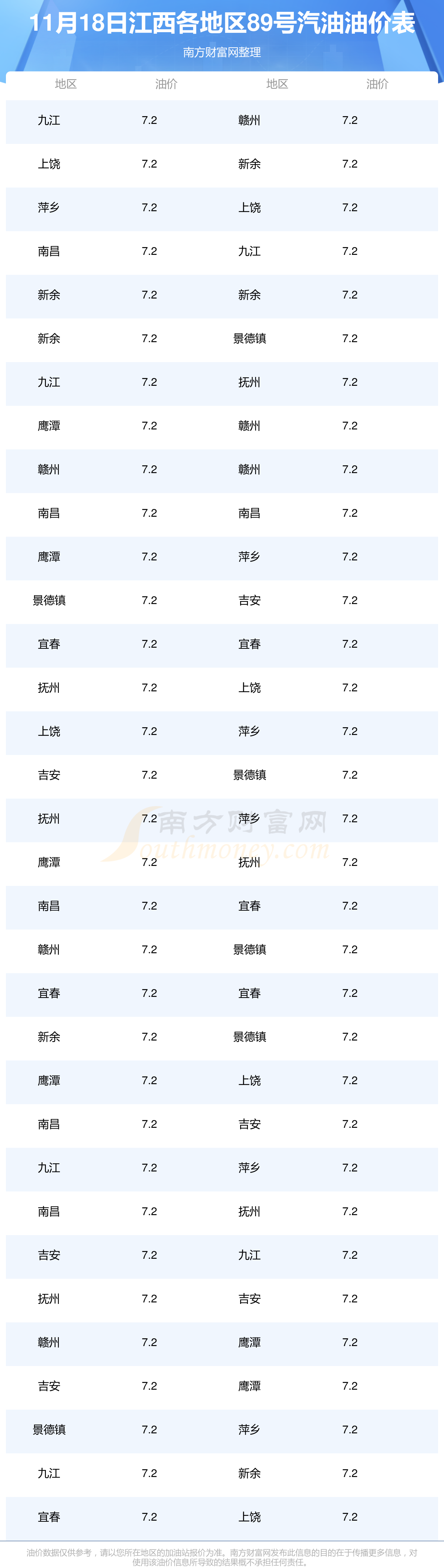 2025年11月18日江西89號(hào)汽油最新價(jià)格一覽表