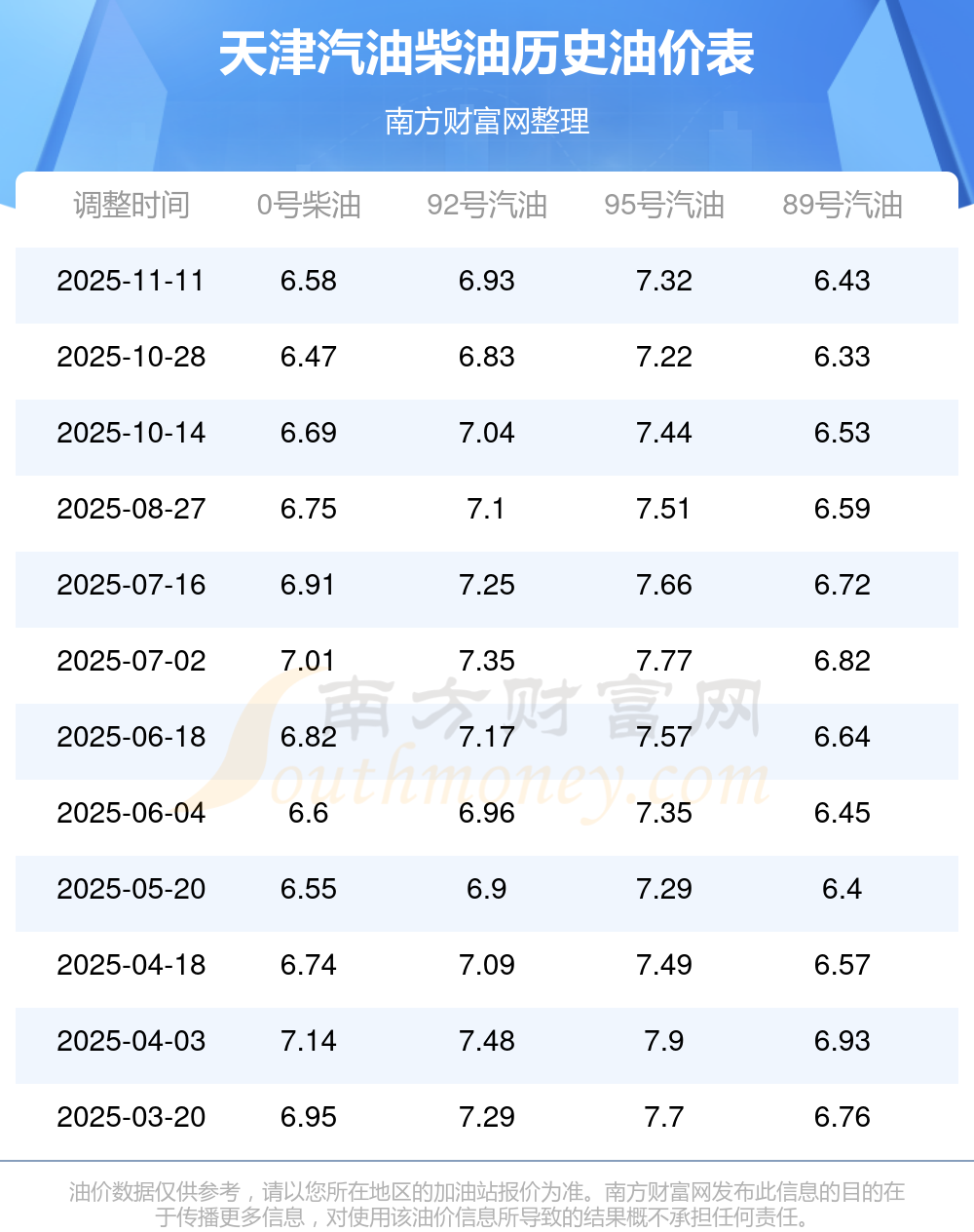 以上數(shù)據(jù)僅供參考,請以您所在地區(qū)的加油站實(shí)際售價(jià)為準(zhǔn)。南方財(cái)富網(wǎng)發(fā)布此信息的目的在于傳播更多信息,對使用該油價(jià)信息所導(dǎo)致的結(jié)果概不承擔(dān)責(zé)任。