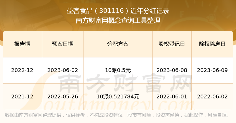 益客食品最新一次公布的分紅方案為10派0.5元。本次權(quán)益分派股權(quán)登記日為2023年6月8日,除權(quán)除息日為2023年6月9日,派息日為2023年6月9日。