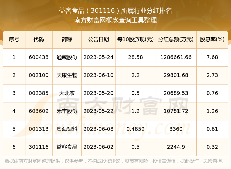 按照南方財富網(wǎng)趨勢選股系統(tǒng)統(tǒng)計,益客食品所屬行業(yè)為食品行業(yè),食品行業(yè)分紅排名情況如下表:
