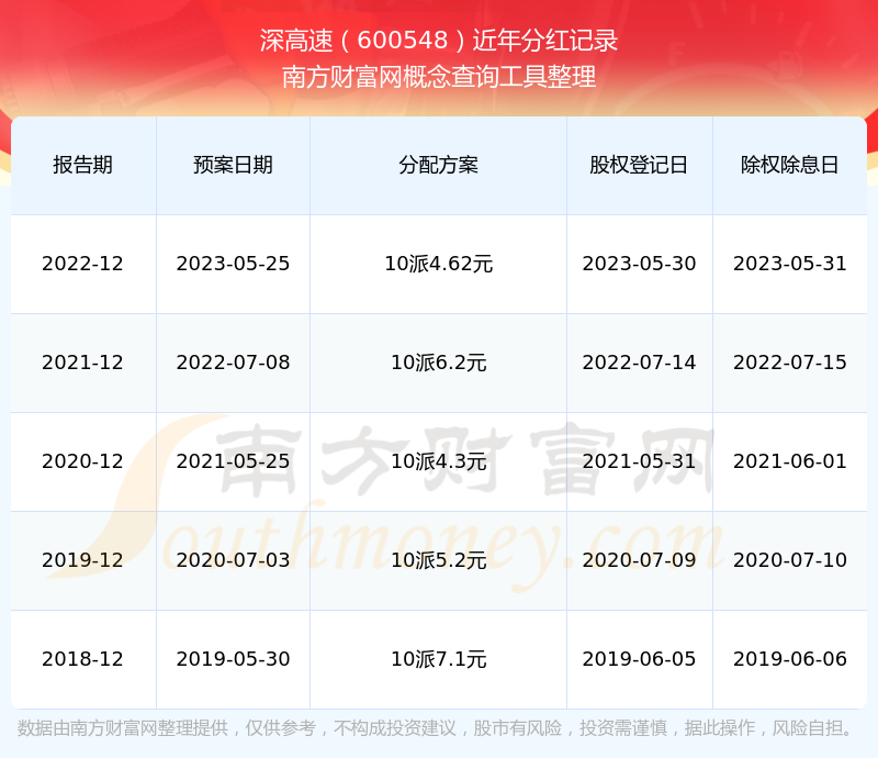 深高速最新一次公布的分紅方案為10派4.62元。本次權(quán)益分派股權(quán)登記日為2023年5月30日,除權(quán)除息日為2023年5月31日,派息日為2023年5月31日。