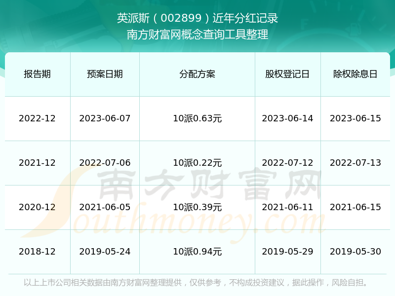 英派斯最新一次公布的分紅方案為10派0.63元。本次權(quán)益分派股權(quán)登記日為2023年6月14日,除權(quán)除息日為2023年6月15日,派息日為2023年6月15日。