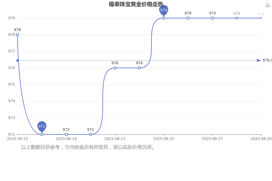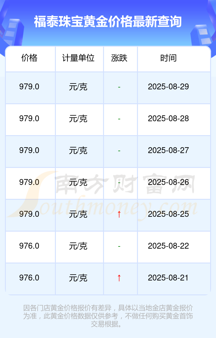 今天黃金價(jià)位是多少?現(xiàn)在一克黃金的價(jià)格是多少呀?一般而言,黃金每克的售價(jià)是多少呢?2025年8月31日福泰珠寶黃金價(jià)格查詢:979.0元/克。