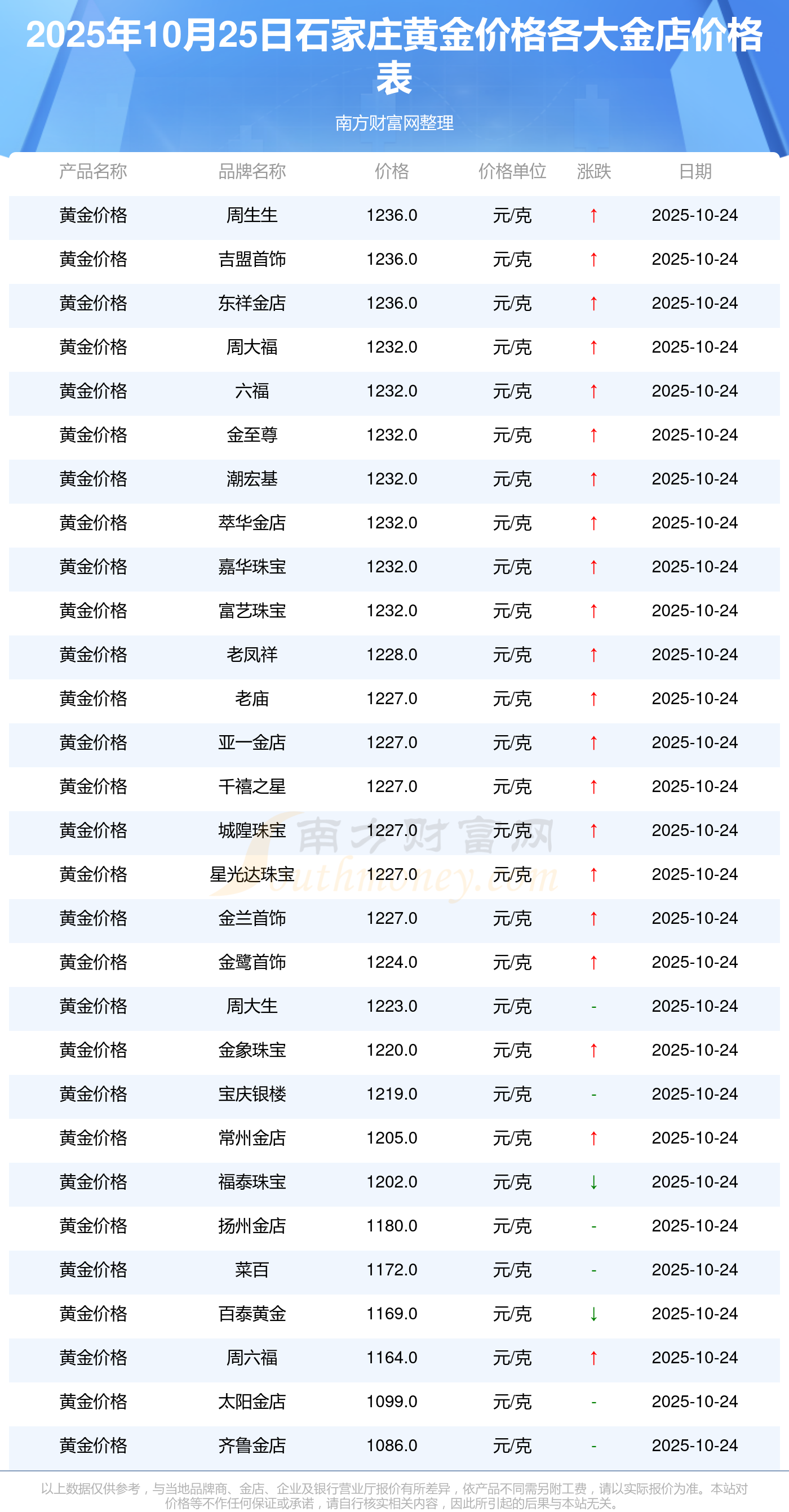 2025年10月25日石家莊老廟、老廟、周生生、周生生、周大福、周大福、周六福、周六福、六福、六福、六福等各大金店品牌黃金價(jià)格最新價(jià)格行情來了,如下:老廟黃金價(jià)格1227.0元/克,老廟鉑金價(jià)格560.0元/克,周生生黃金價(jià)格1236.0元/克,周生生鉑金價(jià)格660.0元/克,周大福黃金價(jià)格1232.0元/克,周大福鉑金價(jià)格660.0元/克,周六福黃金價(jià)格1164.0元/克,周六福鉑金價(jià)格605.0元/克,六福黃金價(jià)格1232.0元/克,六福鉑金價(jià)格660.0元/克,六福鉑金價(jià)格(香港)18970.0。