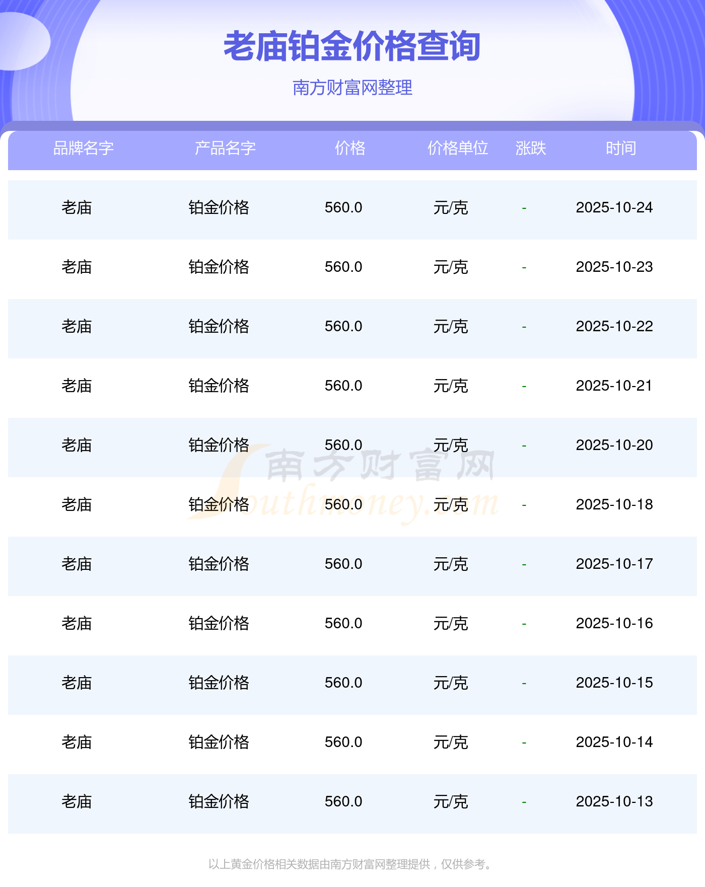今日(2025年10月25日)老廟鉑金價(jià)格是560.0元/克。