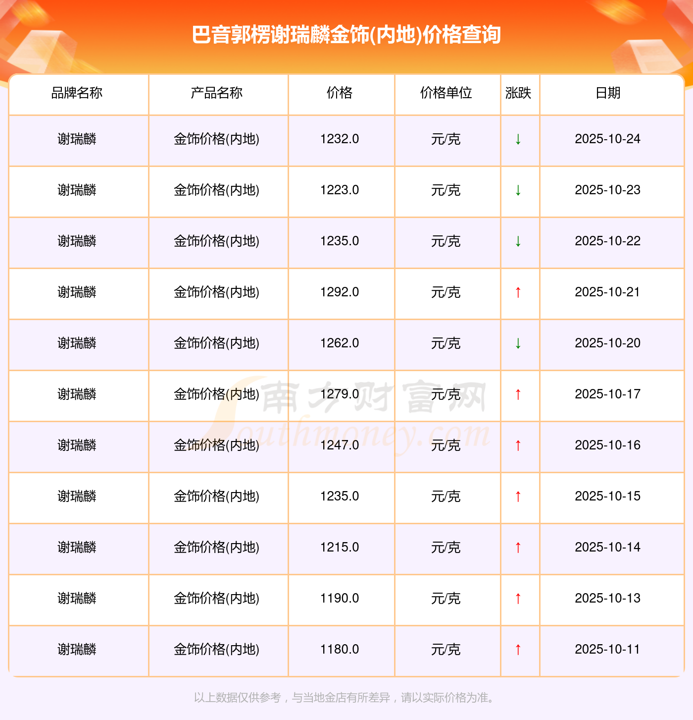 2025年10月25日巴音郭楞謝瑞麟金飾(內(nèi)地)價(jià)格每克多少錢?巴音郭楞謝瑞麟金飾(內(nèi)地)價(jià)格表公布