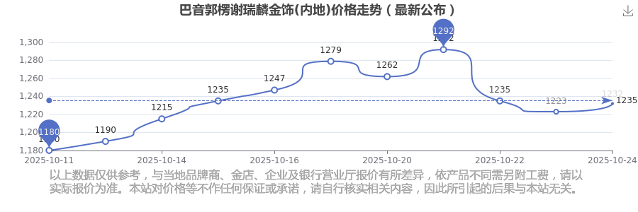 今日2025年10月25日,巴音郭楞謝瑞麟金飾(內(nèi)地)價(jià)格為1232.0元/克。