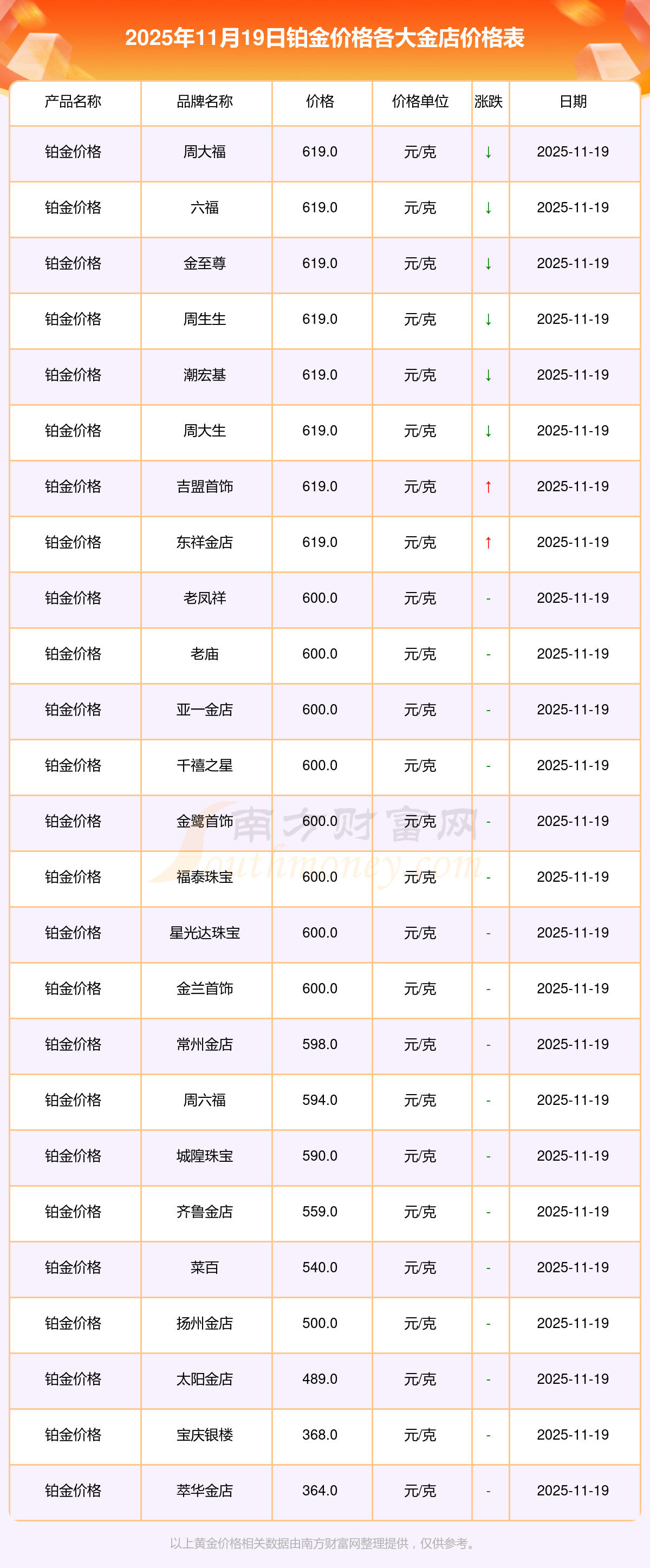 2025年11月19日各大金店鉑金價格最新價格:周大福1295.0元/克,周大福619.0元/克,周大福1295.0元/克,周大福45120.0,周大福17690.0,周大福40700.0,周大福1133.0元/克,老鳳祥1291.0元/克,老鳳祥600.0元/克,老鳳祥1291.0元/克,周六福1263.0元/克。