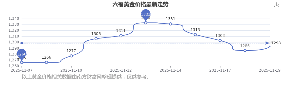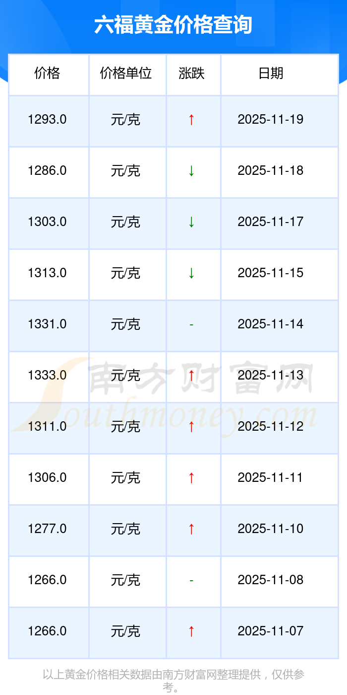 2025年11月19日六福黃金價(jià)格查詢:1293.0元/克。