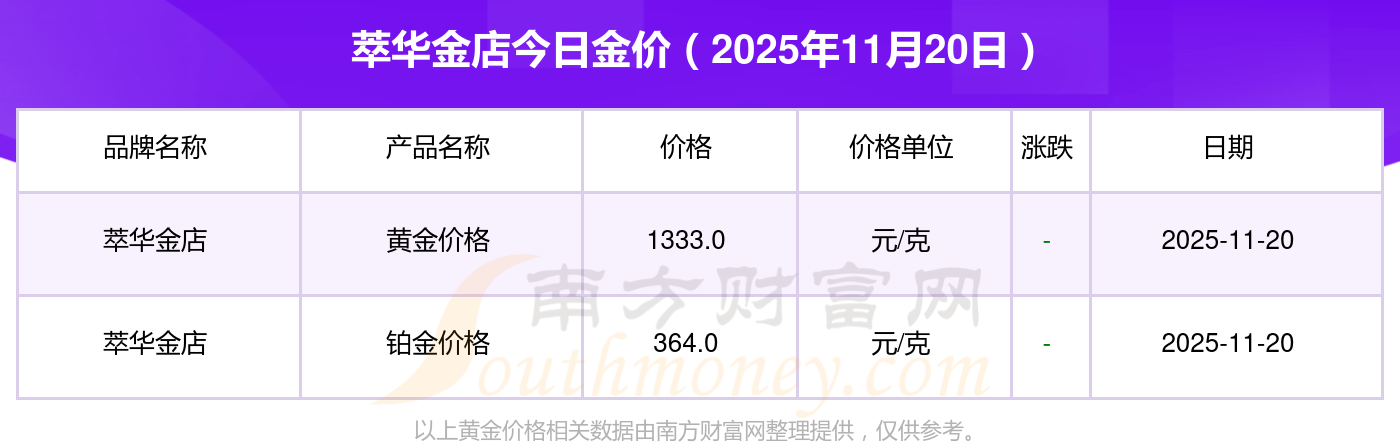 現(xiàn)在萃華金店黃金價格是多少錢1克_2025年萃華金店今日金價是多少錢一克,最新萃華金店查詢,2025年11月20日萃華金店黃金價格現(xiàn)在每克多少錢?最新萃華金店黃金價格報價公布,一起來看看吧!