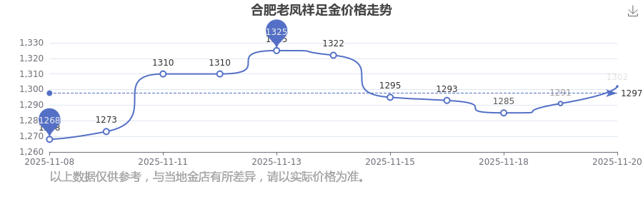 2025年11月20日,合肥老鳳祥的足金價(jià)格標(biāo)價(jià)達(dá)到 1302.0元/克。