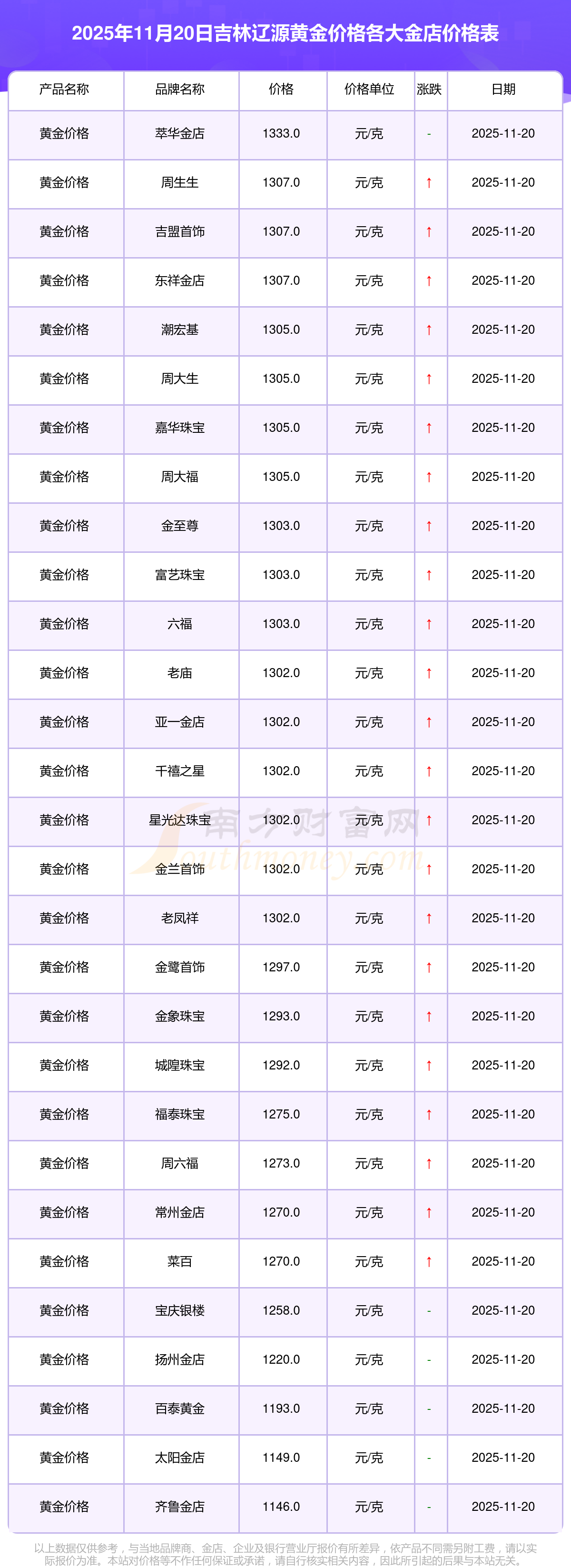 2025年11月20日吉林遼源菜百、菜百、菜百、菜百、菜百、菜百、菜百、菜百、老廟、老廟、老廟等各大金店品牌黃金價(jià)格最新價(jià)格如下:菜百鉑金價(jià)格540.0元/克,菜百PT950鉑金540.0元/克,菜百PT990鉑金545.0元/克,菜百PT999鉑金552.0元/克,菜百飾品金條價(jià)格1060.0元/克,菜百擺件價(jià)格392.0元/克,菜百足金價(jià)格1270.0元/克,菜百基礎(chǔ)銀價(jià)11.8元/克,老廟黃金價(jià)格1302.0元/克,老廟鉑金價(jià)格600.0元/克,老廟金條/金塊價(jià)格1257.0元/克。