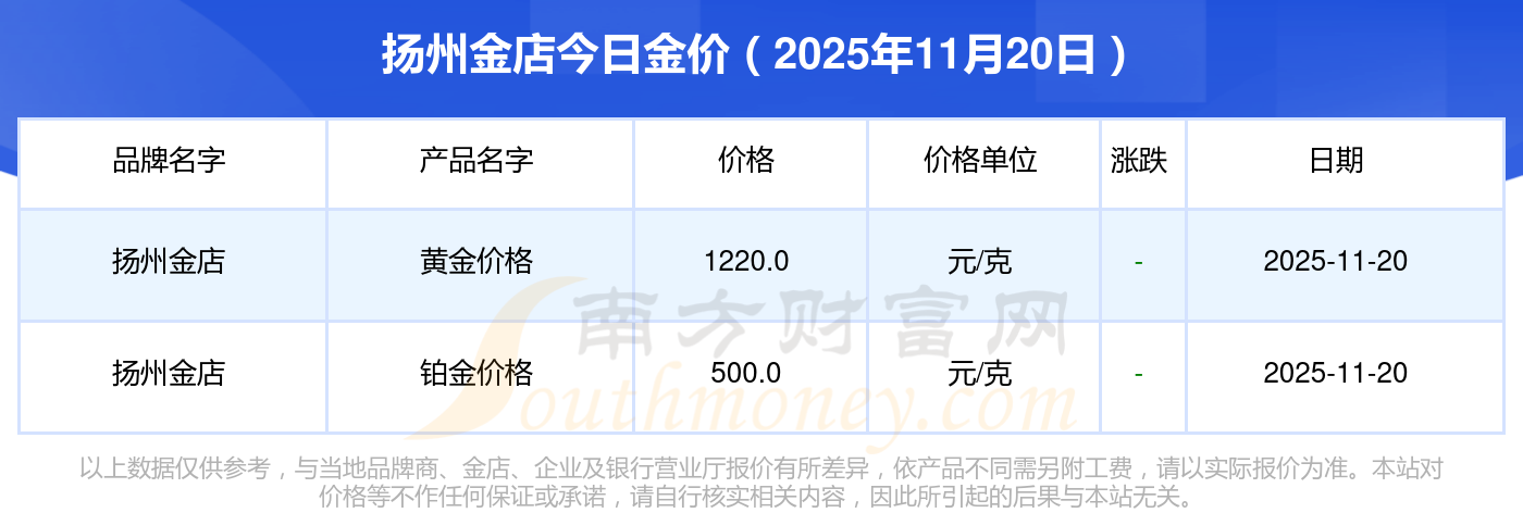 2025年11月20日揚(yáng)州金店最新價(jià)格:鉑金價(jià)格540.0元/克,PT950鉑金540.0元/克,PT990鉑金545.0元/克,PT999鉑金552.0元/克,飾品金條價(jià)格1060.0元/克,擺件價(jià)格392.0元/克,足金價(jià)格1270.0元/克,基礎(chǔ)銀價(jià)11.8元/克,黃金價(jià)格1302.0元/克,鉑金價(jià)格600.0元/克,金條/金塊價(jià)格1257.0元/克。