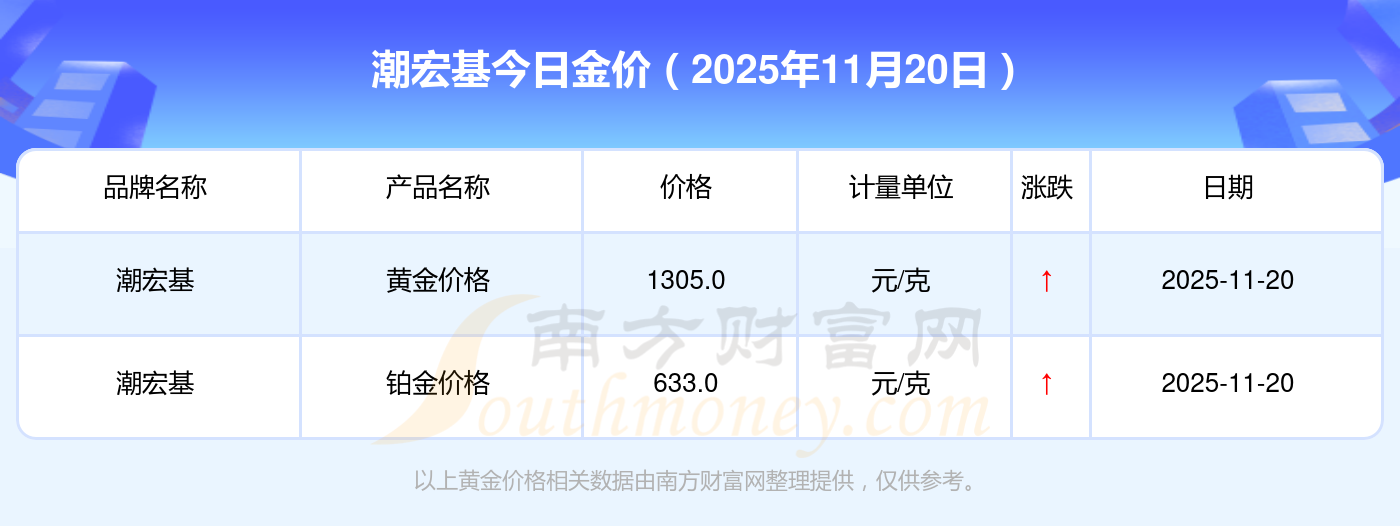 2025年11月20日潮宏基今日價格:鉑金價格540.0元/克,PT950鉑金540.0元/克,PT990鉑金545.0元/克,PT999鉑金552.0元/克,飾品金條價格1060.0元/克,擺件價格392.0元/克,足金價格1270.0元/克,基礎(chǔ)銀價11.8元/克,黃金價格1302.0元/克,鉑金價格600.0元/克,金條/金塊價格1257.0元/克。