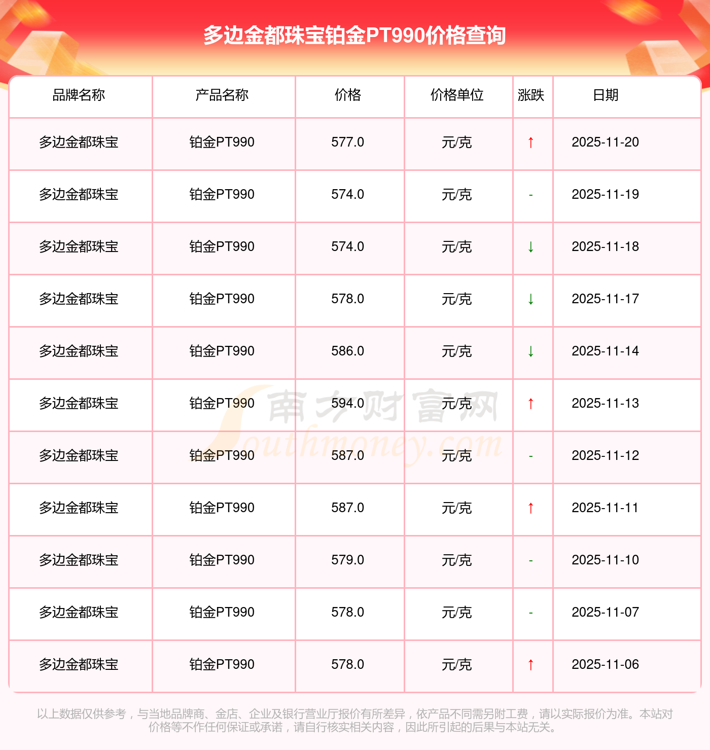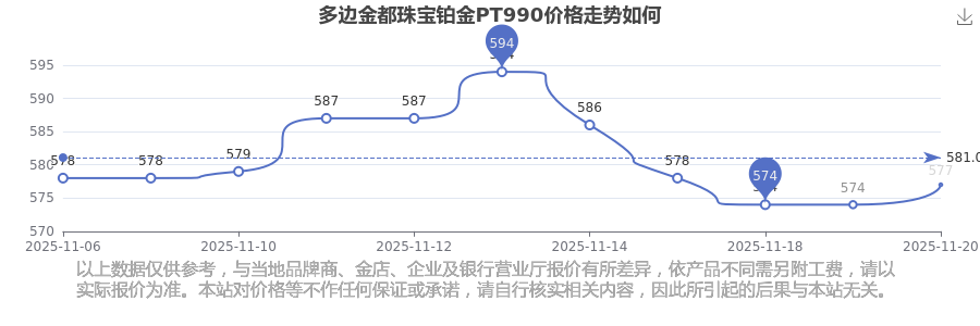 577.0元/克是多邊金都珠寶在今日給出的 鉑金PT990最新價格。