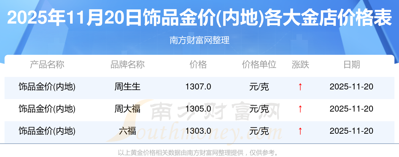2025年11月20日各大金店飾品金價(jià)(內(nèi)地)最新價(jià)格:菜百540.0元/克,菜百540.0元/克,菜百545.0元/克,菜百552.0元/克,菜百1060.0元/克,菜百392.0元/克,菜百1270.0元/克,菜百11.8元/克,老廟1302.0元/克,老廟600.0元/克,老廟1257.0元/克。