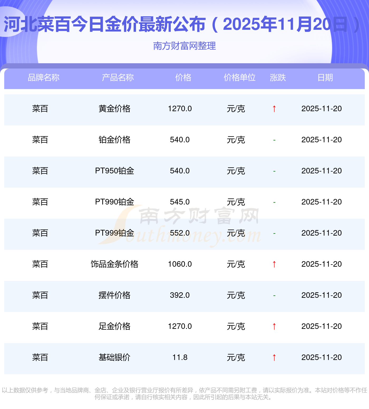 2025年11月20日河北菜百現(xiàn)在黃金一克要多少錢(qián):鉑金價(jià)格540.0元/克,PT950鉑金540.0元/克,PT990鉑金545.0元/克,PT999鉑金552.0元/克,飾品金條價(jià)格1060.0元/克,擺件價(jià)格392.0元/克,足金價(jià)格1270.0元/克,基礎(chǔ)銀價(jià)11.8元/克,黃金價(jià)格1302.0元/克,鉑金價(jià)格600.0元/克,金條/金塊價(jià)格1257.0元/克。