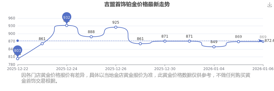 869.0元/克成為吉盟首飾今日 鉑金價格的最新交易的價格。