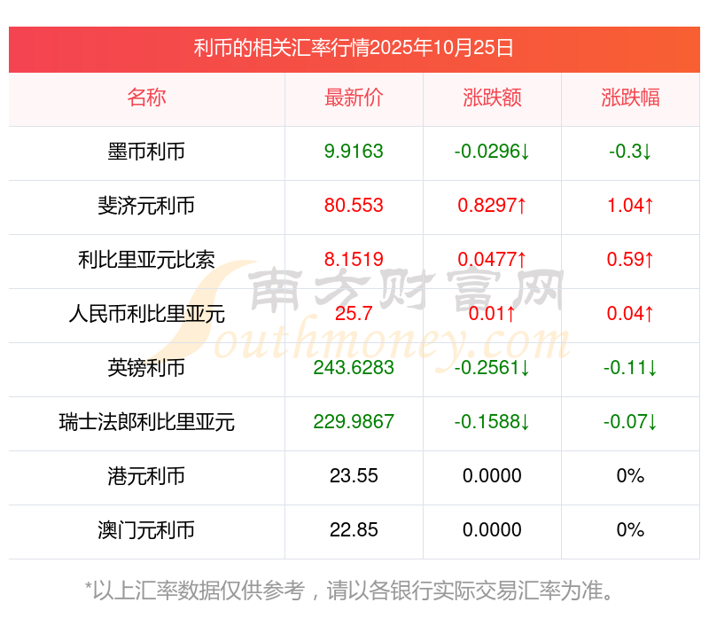 根據2025年10月25日匯率計算,LRD兌換ZAR匯率最新價0.094340:今日開價0.0943,昨日收價0.0943,最高價0.0949,最低價0.0941。