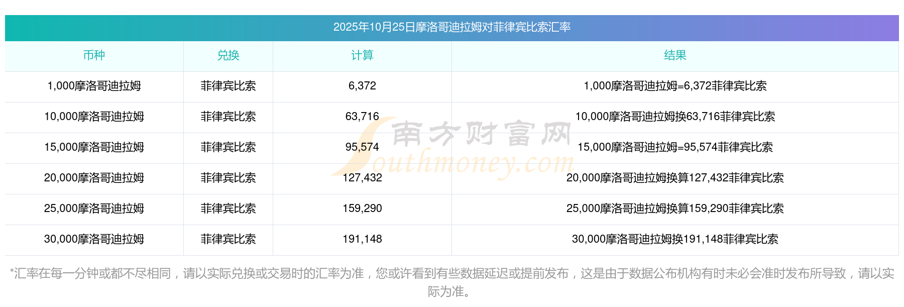 2025年10月25日菲律賓比索換摩洛哥迪拉姆匯率是:0.15695