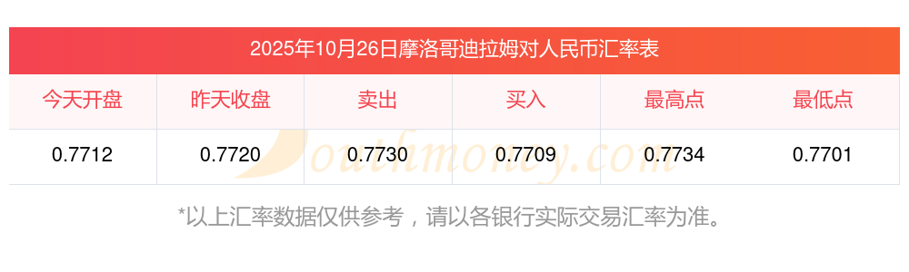 2025年10月26日摩洛哥迪拉姆兌換人民幣匯率是:0.772