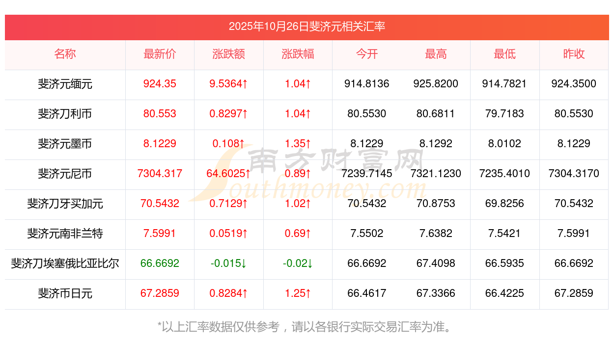 2025年10月26日斐濟(jì)元相關(guān)匯率查詢