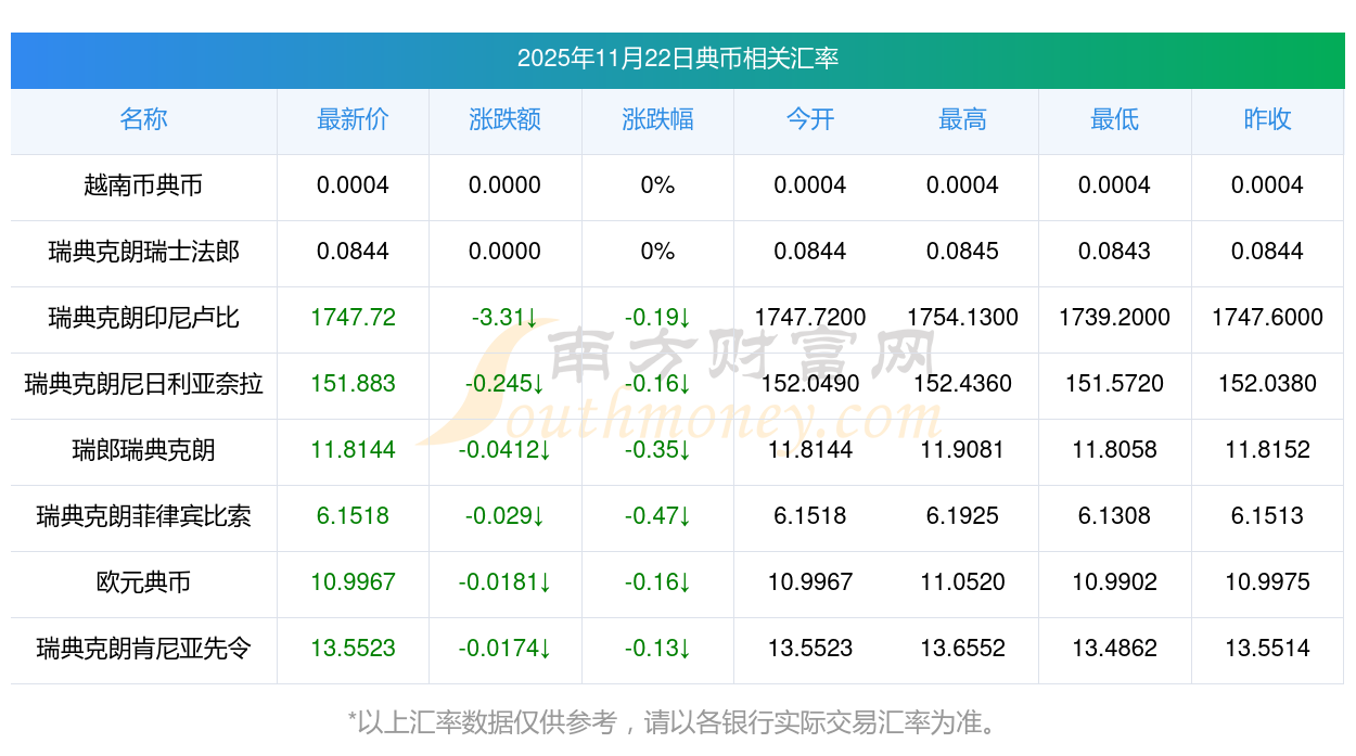 根據(jù)2025年11月22日匯率計(jì)算,SEK兌換ZAR匯率最新價(jià)1.819200:今開價(jià)1.8192,昨收價(jià)1.8190,最高價(jià)1.8255,最低價(jià)1.8005。