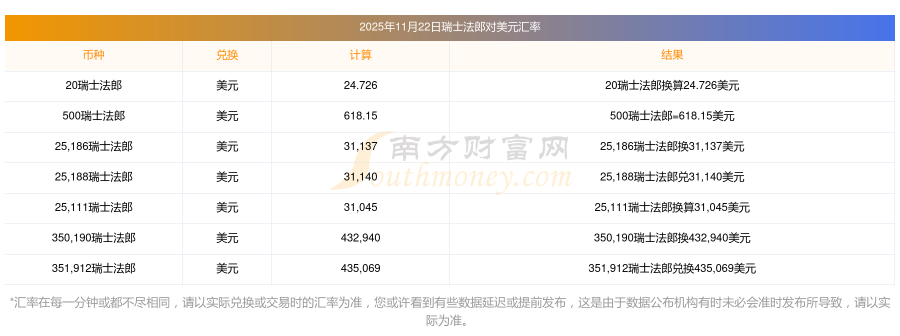 2025年11月22日4瑞士法郎計(jì)算美元等于多少?