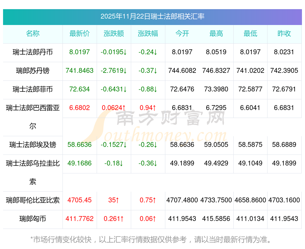 2025年11月22日瑞士法郎相關(guān)匯率查詢
