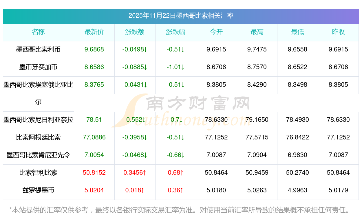 根據(jù)2025年11月22日匯率計算,MXN兌換UYU匯率最新價2.152200:今開價2.1532,昨收價2.1532,最高價2.1657,最低價2.1453。