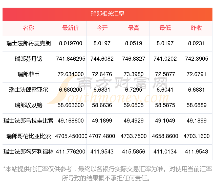 南方財富網為您提供瑞郎對利幣匯率最新價格詳情。