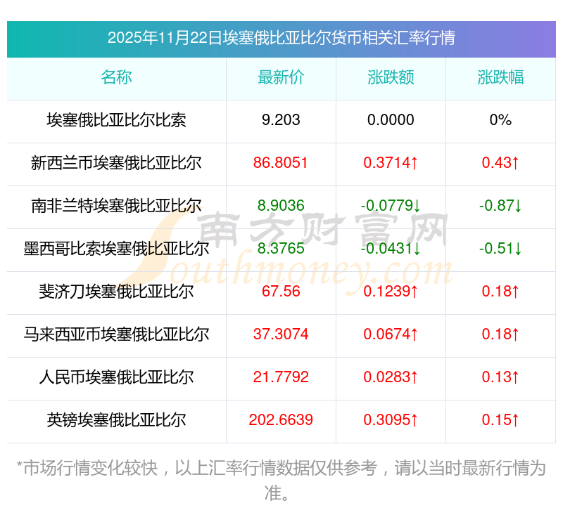 根據(jù)2025年11月22日匯率,埃塞俄比亞比爾兌換比索匯率最新9.203000,今開(kāi)9.2030,昨收9.2030,最高9.2030,最低9.2030。
