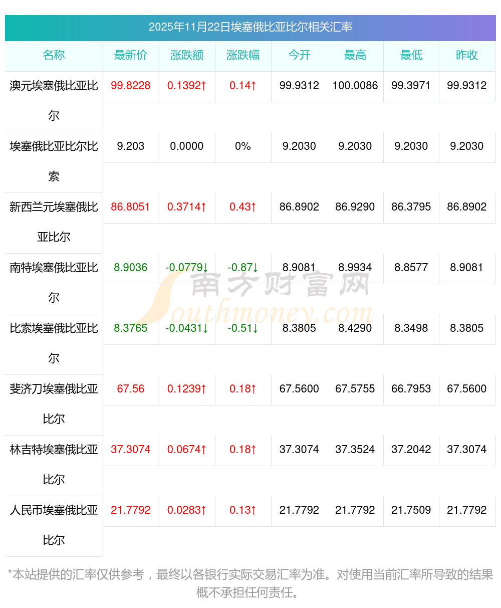 2025年11月22日埃塞俄比亞比爾相關(guān)匯率查詢