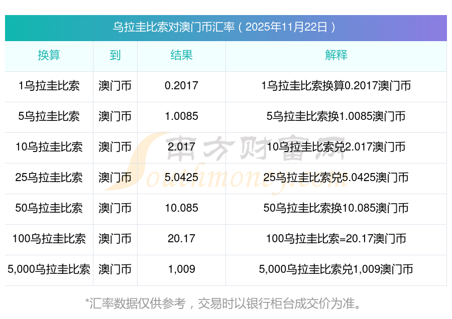 南方財富網為您提供烏拉圭比索對澳門幣匯率最新價格詳情。