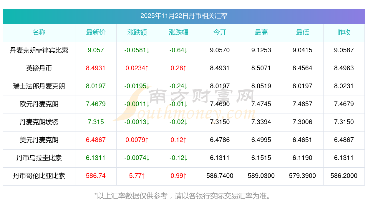 2025年11月22日最新消息,丹幣兌換尼幣最新匯率為2573.580000,今開為2582.3500,昨收為2573.5800,最高為2585.0400,最低為2568.5100。
