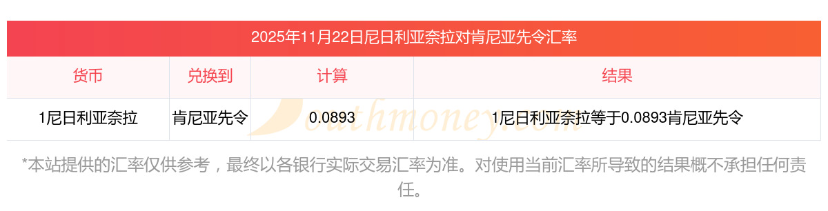 2025年11月22日尼日利亞奈拉兌換肯尼亞先令匯率是:0.0893