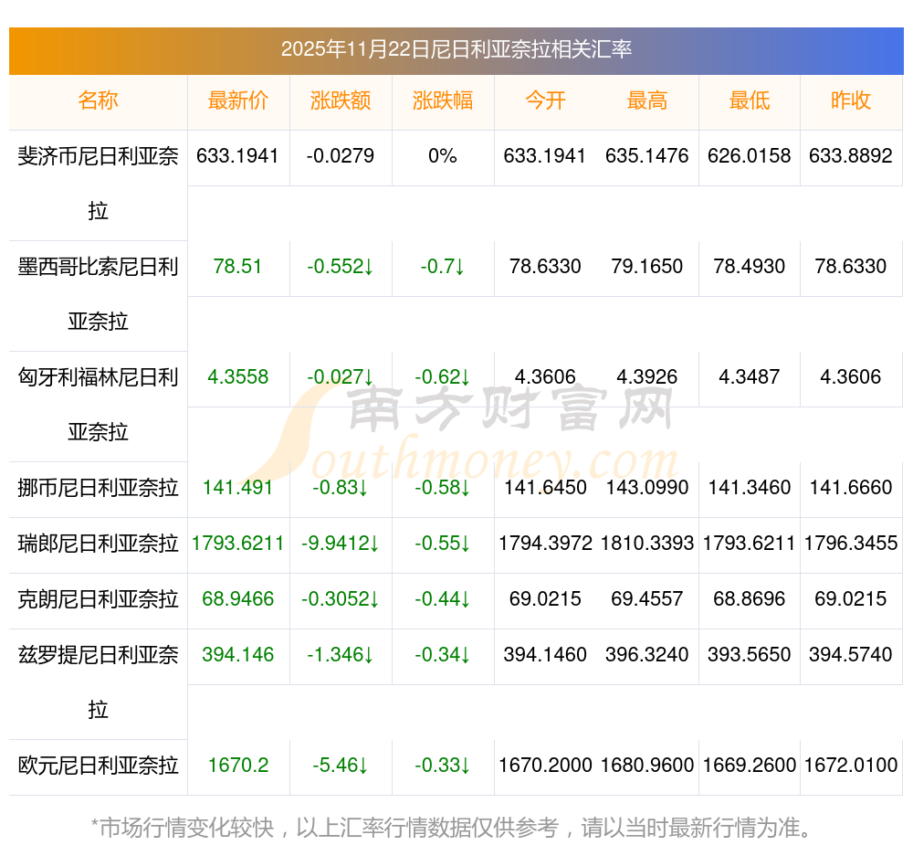 2025年11月22日尼日利亞奈拉相關(guān)匯率查詢