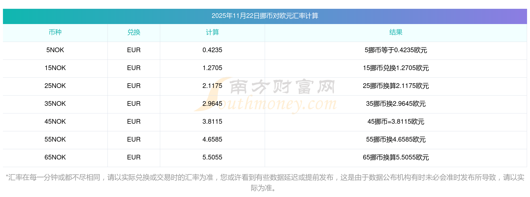 南方財富網為您提供挪幣對歐元匯率最新價格詳情。