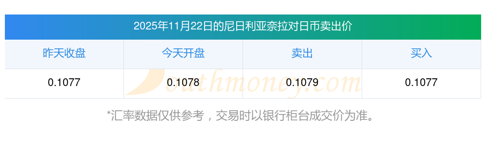 2025年11月22日尼日利亞奈拉兌換日幣的匯率為:0.1078