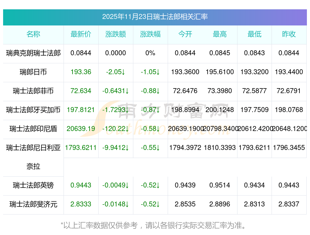 2025年11月23日瑞士法郎相關(guān)匯率查詢