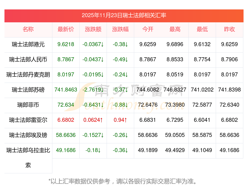 2025年11月23日瑞士法郎相關(guān)匯率查詢
