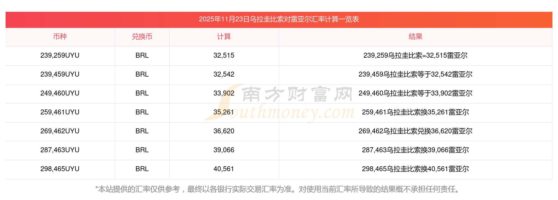 匯率實(shí)時(shí)更新!97烏拉圭比索兌換雷亞爾匯率表(2025年11月23日)