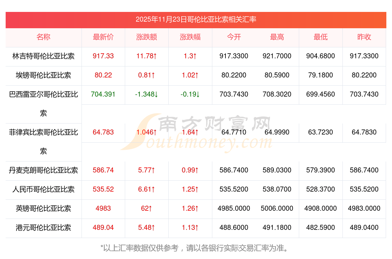 2025年11月23日哥倫比亞比索相關(guān)匯率查詢(xún)