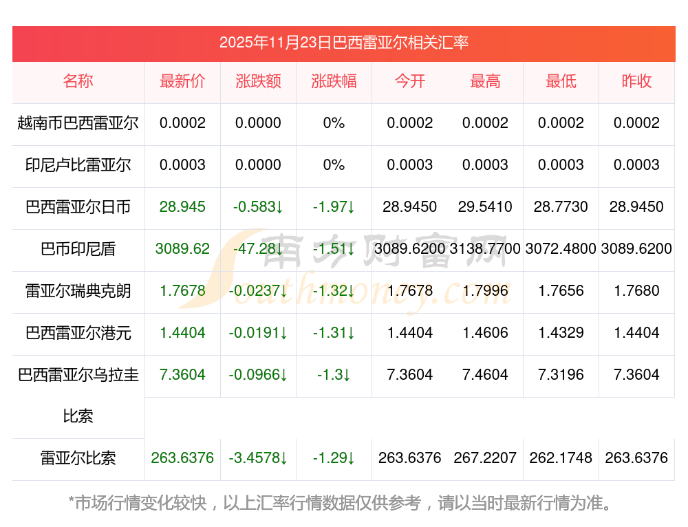 2025年11月23日巴西雷亞爾相關(guān)匯率查詢