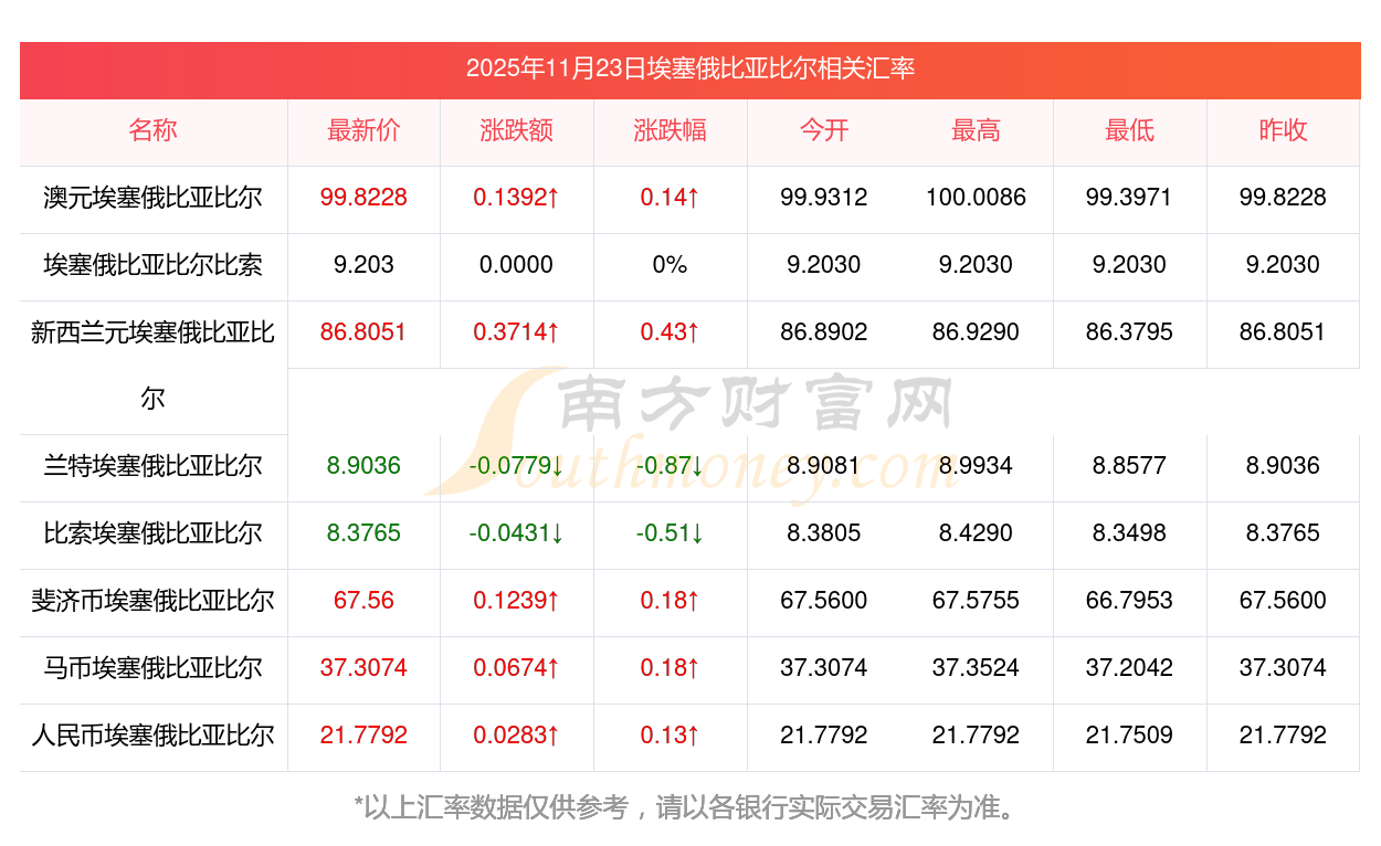 2025年11月23日埃塞俄比亞比爾相關(guān)匯率查詢(xún)