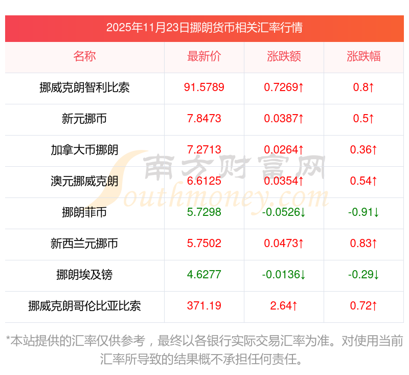 2025年11月23日最新消息,挪朗兌換比索最新匯率為1.802200,今開為1.8014,昨收為1.8022,最高為1.8095,最低為1.7948。