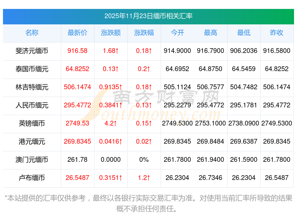 2025年11月23日緬幣兌換澳門元最新匯率:0.003820,今開:0.0038,昨收:0.0038,最高:0.0038,最低:0.0038。