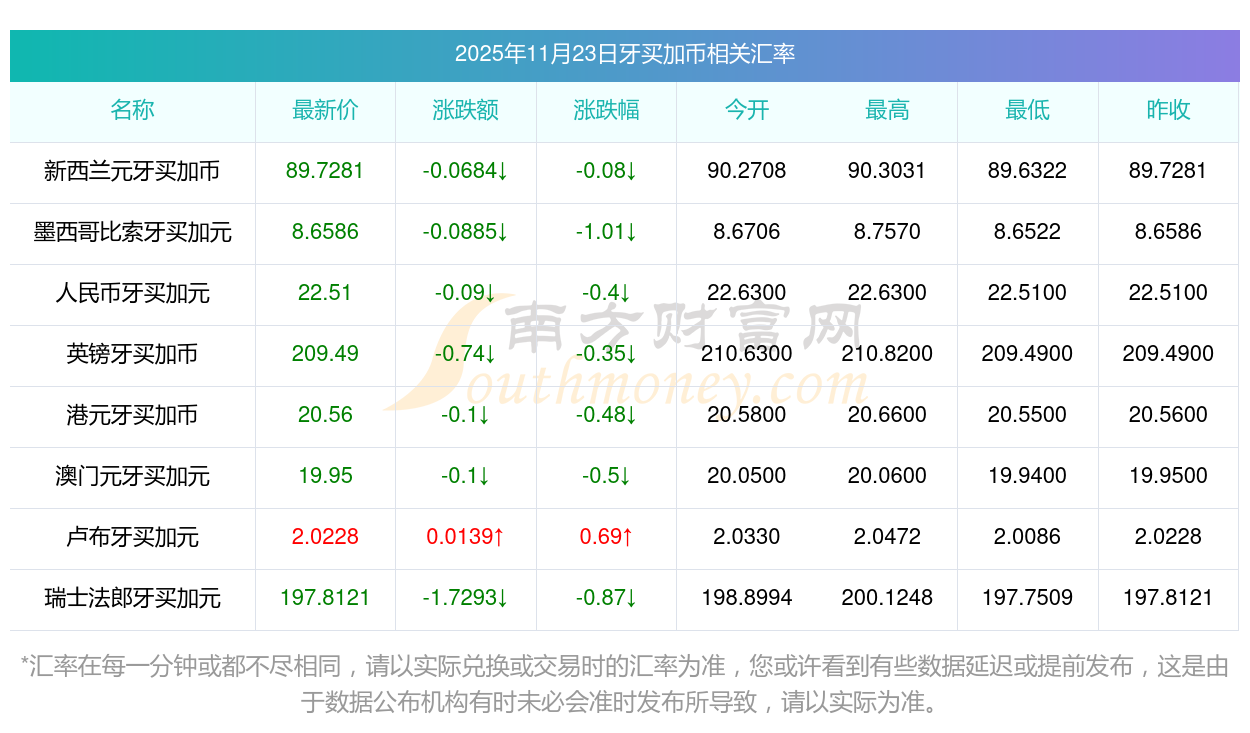 2025年11月23日最新消息,牙買(mǎi)加幣兌換新西蘭幣最新匯率為0.011150,今開(kāi)為0.0111,昨收為0.0112,最高為0.0112,最低為0.0111。