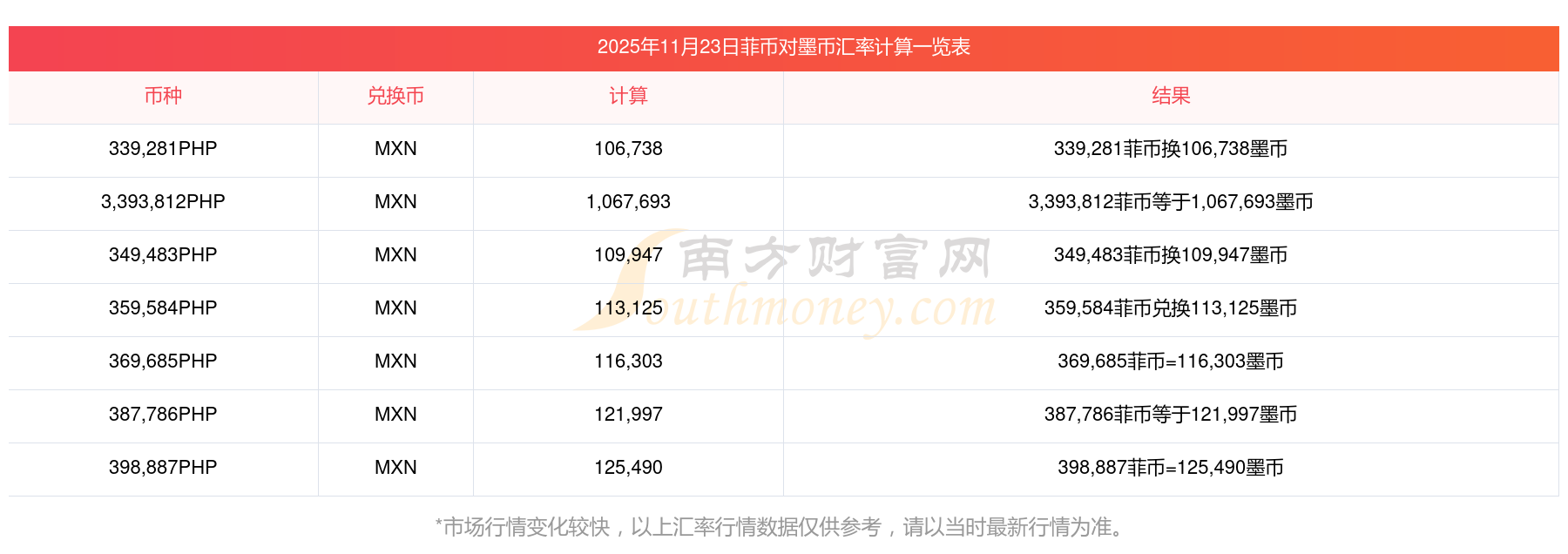 根據(jù)今日匯率:1菲幣、2菲幣、5菲幣、10菲幣、20菲幣、50菲幣、100菲幣,分別折合墨幣0.3146、0.6292、1.573、3.146、6.292、15.73、31.46墨幣。