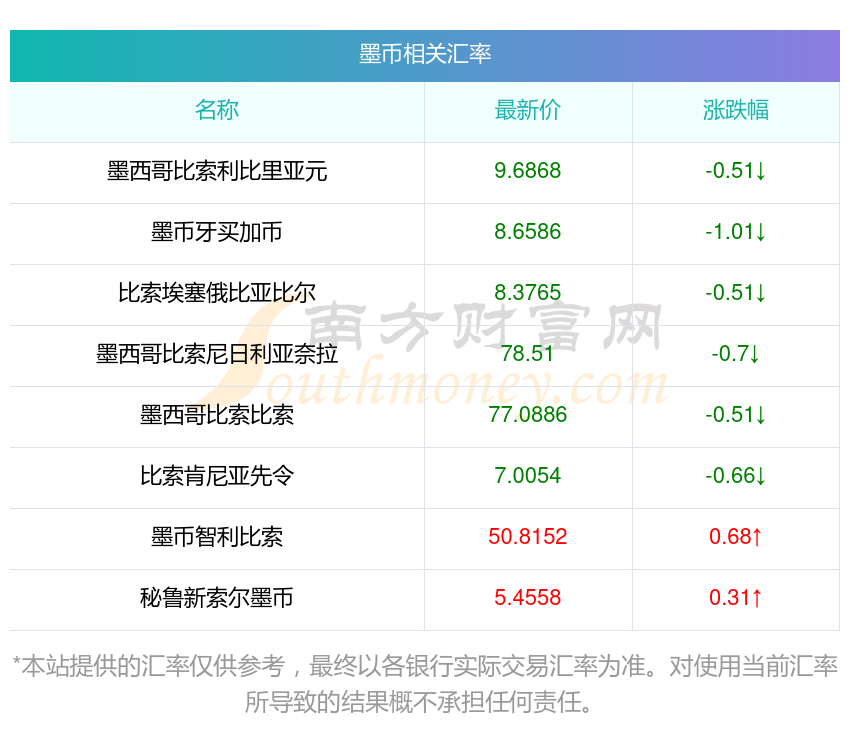 南方財富網(wǎng)為您提供墨幣對智利比索匯率最新價格詳情。